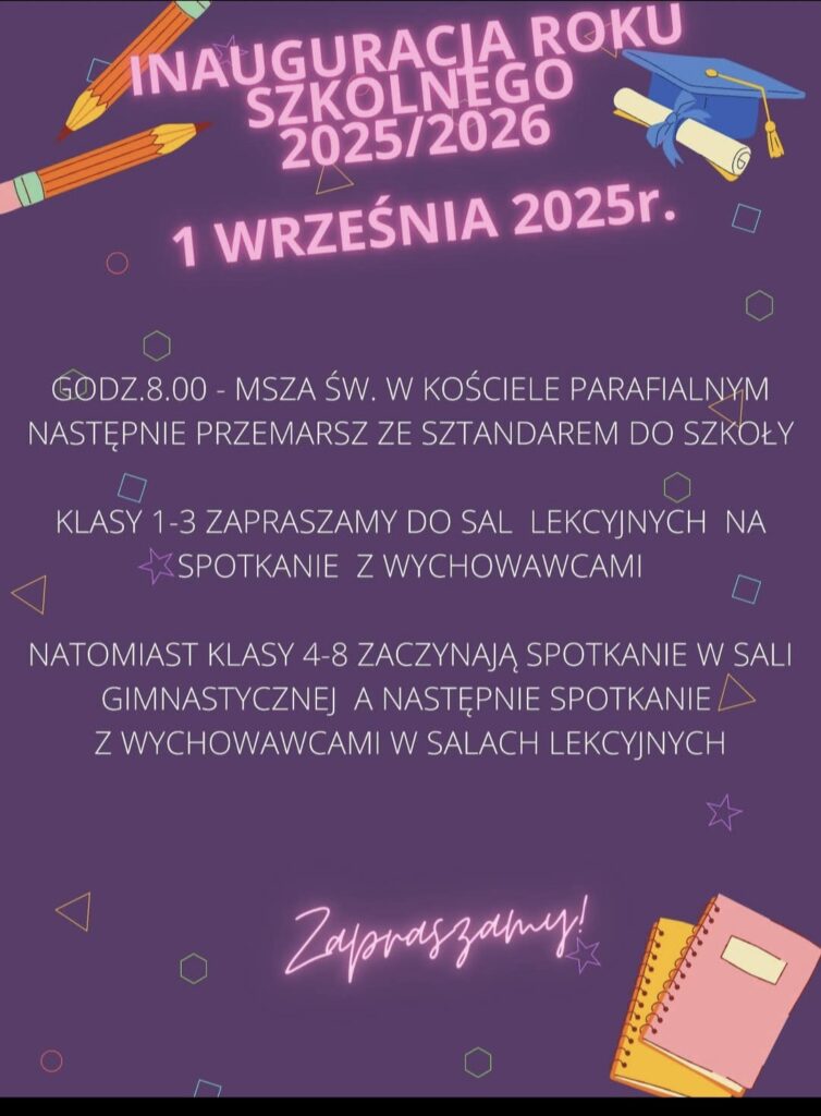 INAUGURACJA ROKU SZKOLNEGO 2025/2026 / Bez kategorii / Przez Natalia Witaj szkoło! Zapraszamy do zapoznania się z informacjami na temat rozpoczęcia roku szkolnego 2025/2026 w naszej szkole.