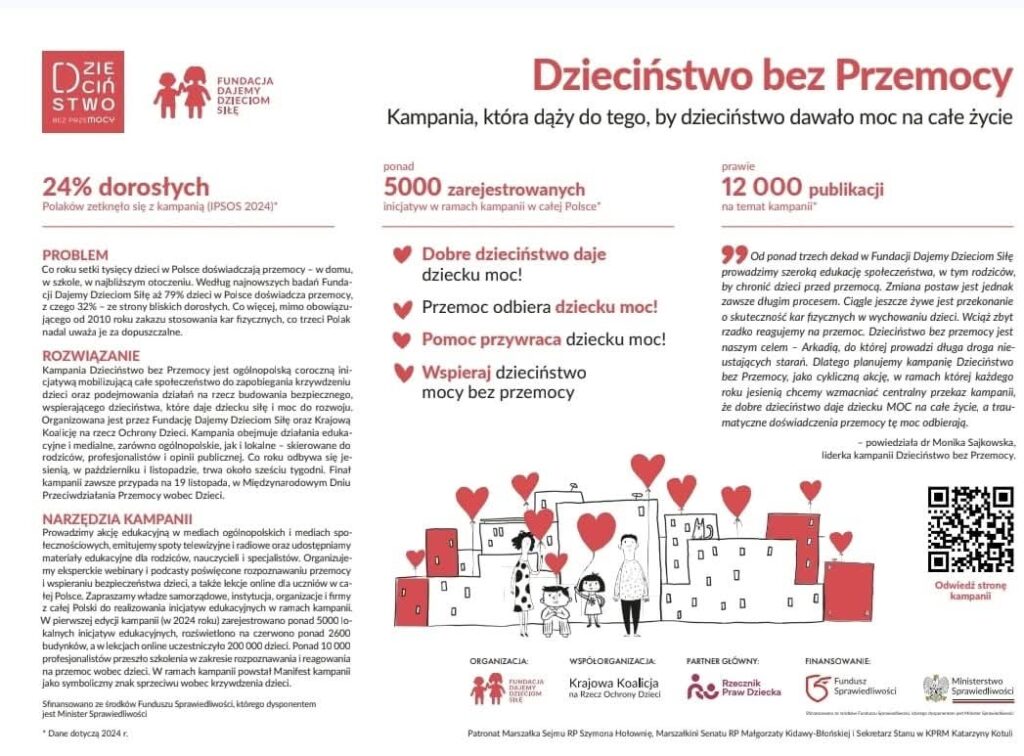 W październiku po raz drugi nasza szkoła dołączyła do ogólnopolskiej akcji „Dzieciństwo bez przemocy”, której celem jest zwrócenie uwagi na potrzebę budowania bezpiecznego, pełnego zrozumienia i szacunku środowiska dla każdego dziecka. Inicjatywa ta przypomina, że przemoc – fizyczna, psychiczna czy słowna – nigdy nie jest metodą wychowawczą i zawsze pozostawia ślad w życiu młodego człowieka.