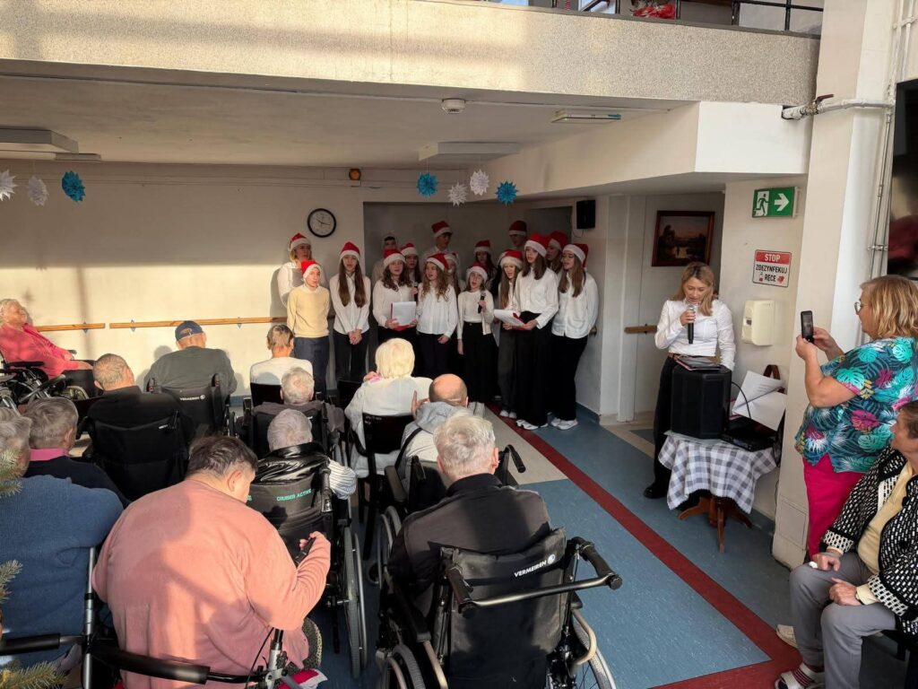 W przedświątecznej atmosferze uczniowie ze szkolnego wolontariatu wraz z opiekunami oraz Przewodniczącą Rady Rodziców p. Katarzyną Wojciechowską odwiedzili Dom Pomocy Społecznej w Tomczycach.