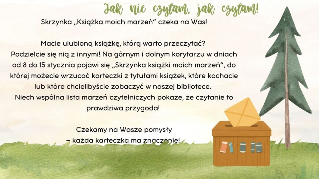 Zakończyliśmy naszą szkolną akcję „Skrzynka książki moich marzeń”, która cieszyła się ogromnym zainteresowaniem uczniów!