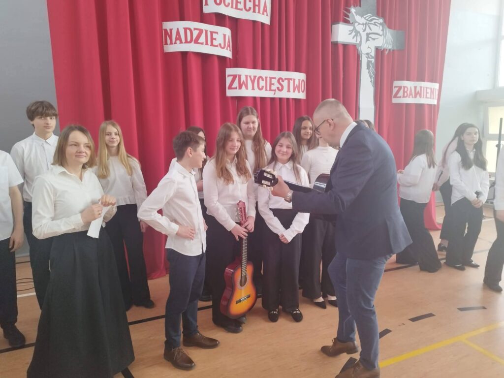 Uczniowie klas 6 zaprezentowali swoje talenty:Judyta i Kamila – zagrały na gitarach. Blanka i Martyna – uświetniły występ tańcem. Mama Marcelego p. Małgosia – przepięknie zaśpiewała.